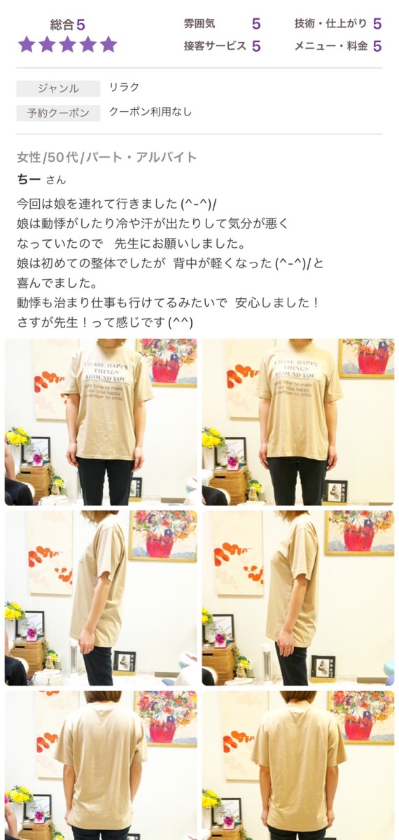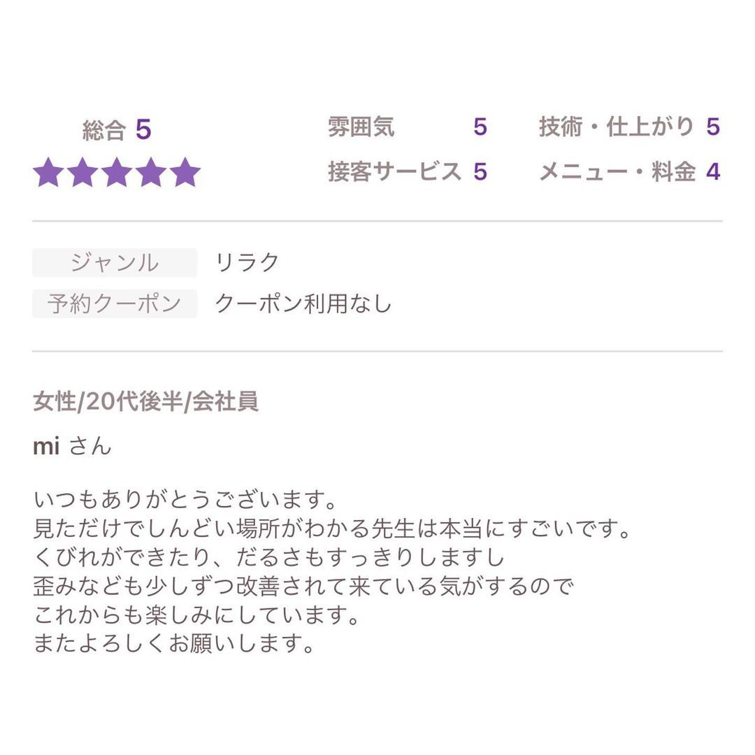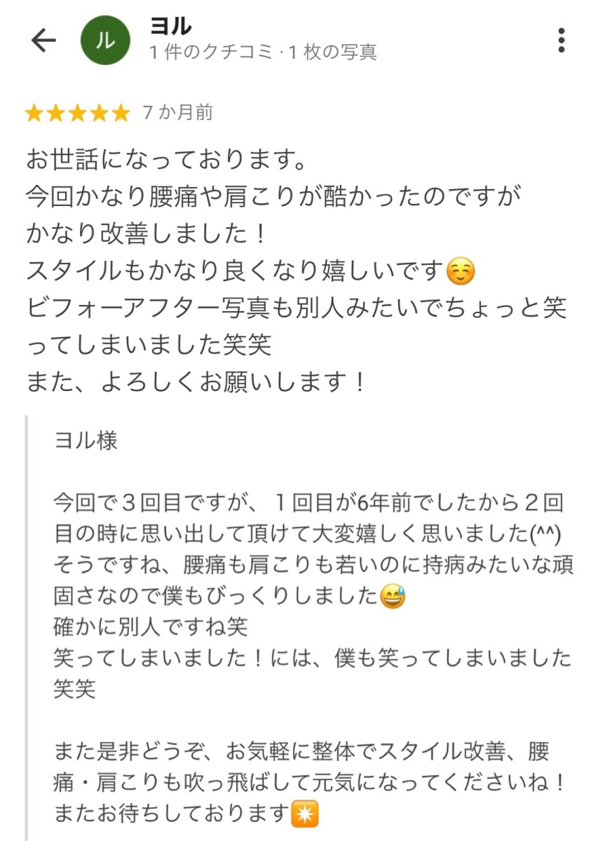 そして施術は神技です。辛いところ全て治してくれます。先生は神の手を持っていると思っています!うちは娘 娘婿 息子 妹みんな先生の神の手で治してもらっています。