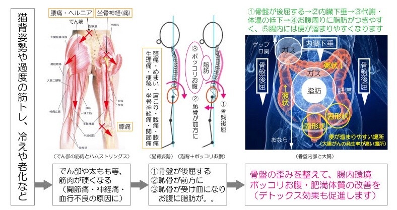 - 骨盤の歪みを整えることで、腸の位置・血流・神経伝達が正常に。